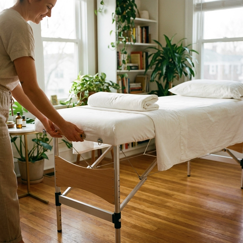 Equipment needs minimal. Massage table primary expense. Linens and oils basic requirements. Office space optional initially.